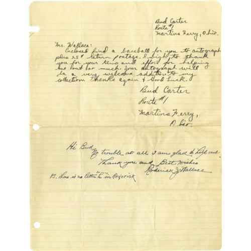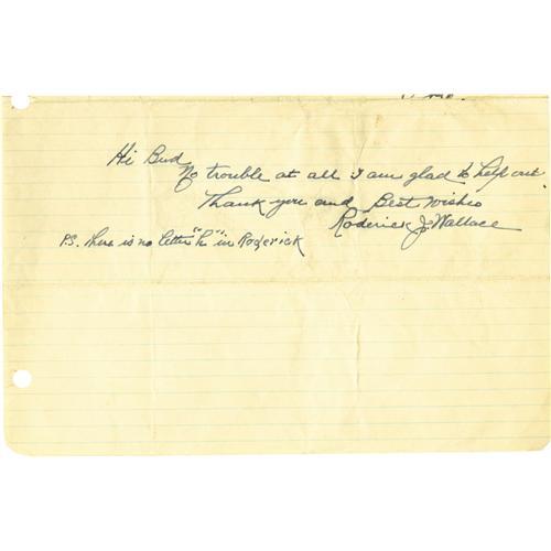 <B>1950's Roderick Wallace Handwritten Signed Note.</B></I> Despite six decades in the game as a player, manager, umpire and scout, the supply of Wallace autographs in the hobby is slim at best. Here we present a brief note written to a young collector in response to an autograph request. Wallace writes, "Hi Bud, No trouble at all. I am glad to help out. Thank you and Best wishes, Roderick J. Wallace. P.S. There is no letter "h" in Roderick." All ink is a flawless 10/10, and the postscript could be argued to be a second autograph of sorts. The lined page shows original mailing folds and mild wear, but these factors do not negatively affect Wallace's writing. A very tough piece certain to turn the heads of advanced autograph collectors. <I>LOA from PSA/DNA.</B></I>