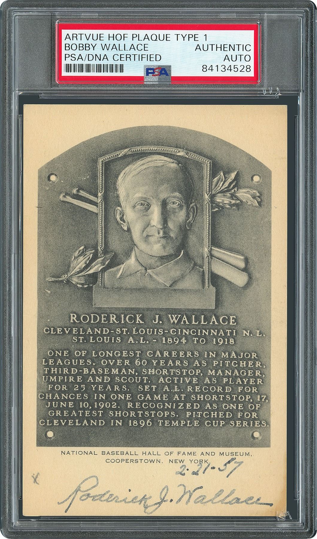 Artvue Type I black-and-white Hall of Fame plaque card, signed in the lower border in fountain pen, "2-21-57, Roderick J. Wallace." In fine condition, with a lightly penciled "x" to the lower left and light edge toning. Encapsulated in a PSA/DNA authentication holder.