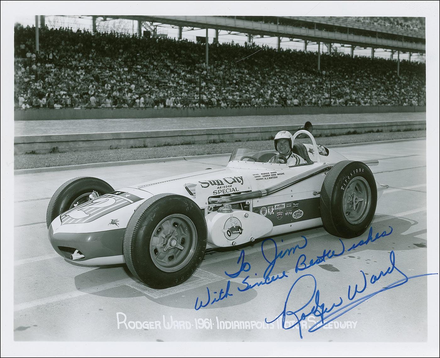 American race car driver (1921–2004) who participated in 12 world championship races and who won the Indianapolis 500 in 1959 and 1962. Glossy 10 x 8 photo, signed and inscribed in blue felt tip “To Jim, With sincere best wishes, Rodger Ward.” In fine condition.