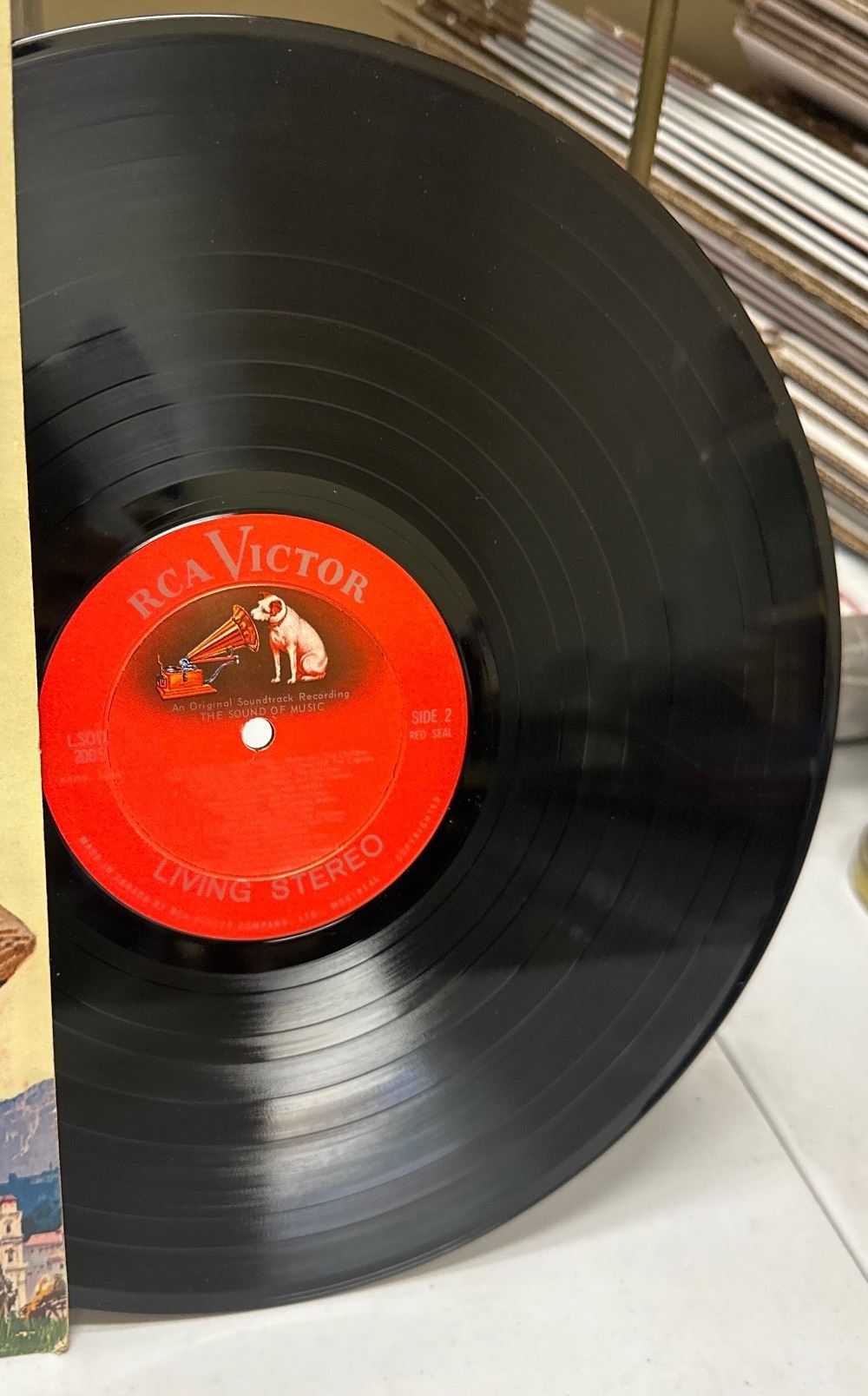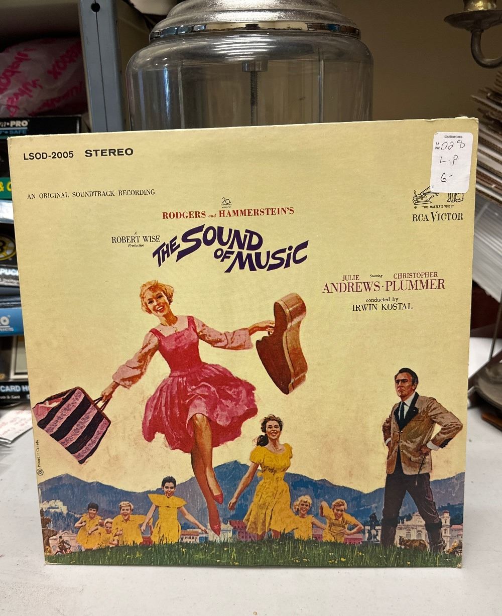 Sleeve shows visible wear including age-related yellowing, softened corners/edges, and a sticker on the front cover. The vinyl has a good gloss and appears to have light surface marks.
