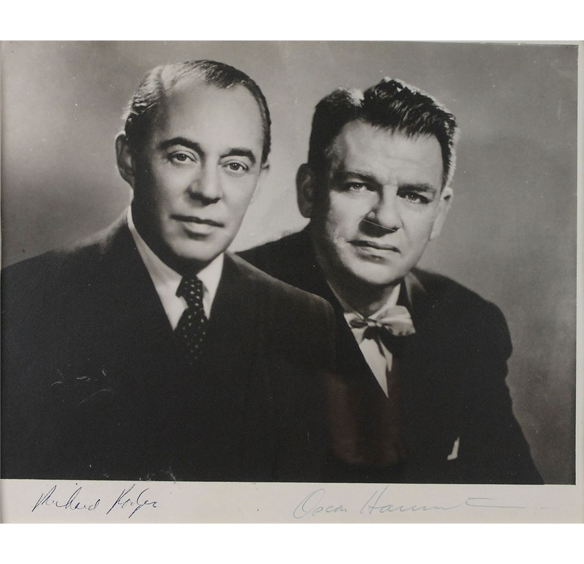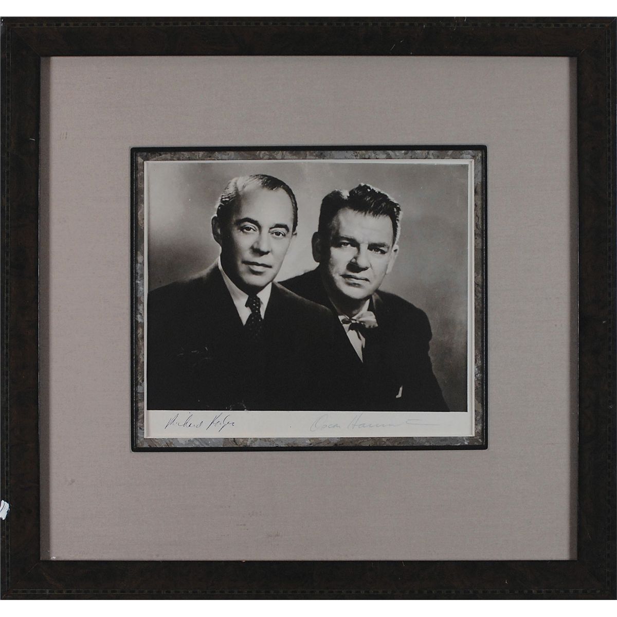 Desirable vintage matte-finish 9.5 x 8 photo of the smartly-dressed composers posing together, signed in the lower border in black ink, “Richard Rogers,” and in blue ballpoint, “Oscar Hammerstein.” Double-matted and framed to an overall size of 17.5 x 16.75. In fine condition. Signed portraits of the pair are quite scarce.