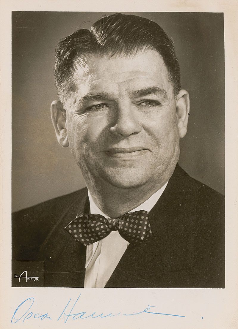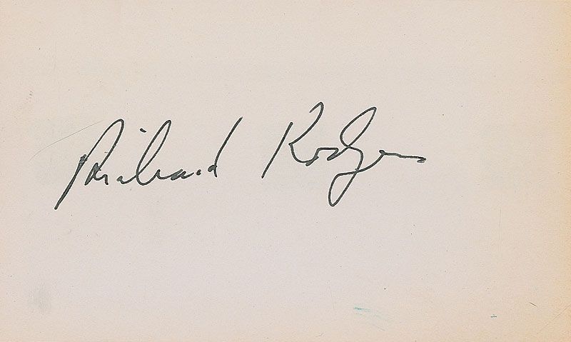 Two items: vintage glossy 5 x 7 photo of Oscar Hammerstein, signed in the lower border in blue ballpoint; and a vintage ink signature, “Richard Rodgers,” on an off-white 5 x 3 card. Both items are affixed to an 8 x 11.5 scrapbook page. In fine condition, with a few scattered surface marks and impressions to photo.
