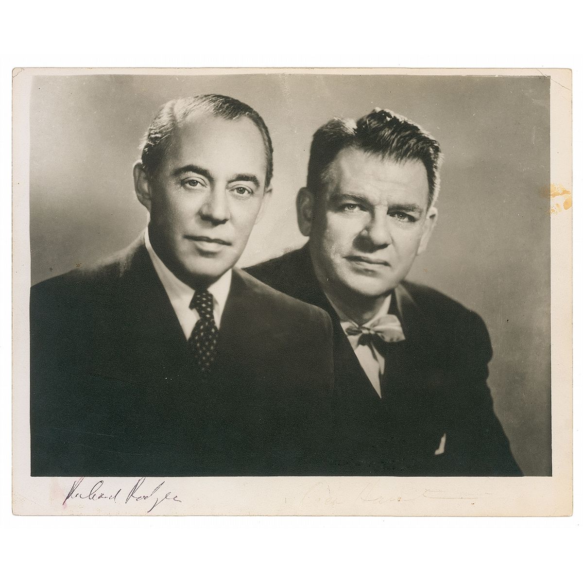 Vintage matte-finish 10 x 8 portrait of the duo posing together, signed in the lower border in ink, “Richard Rodgers” and “Oscar Hammerstein.” Reverse bears a G. Maillard Kesslere photographer’s stamp. In very good condition, with some light staining and creases to edges, and Hammerstein’s signature extremely light but mostly legible.