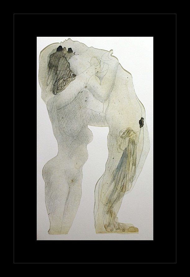Erotic sketch lithograph by Auguste Rodin titled, "Sapphie Couple in Profile".The original, date unknown, is pencil and watercolor.  Comes gallery framed black on black.