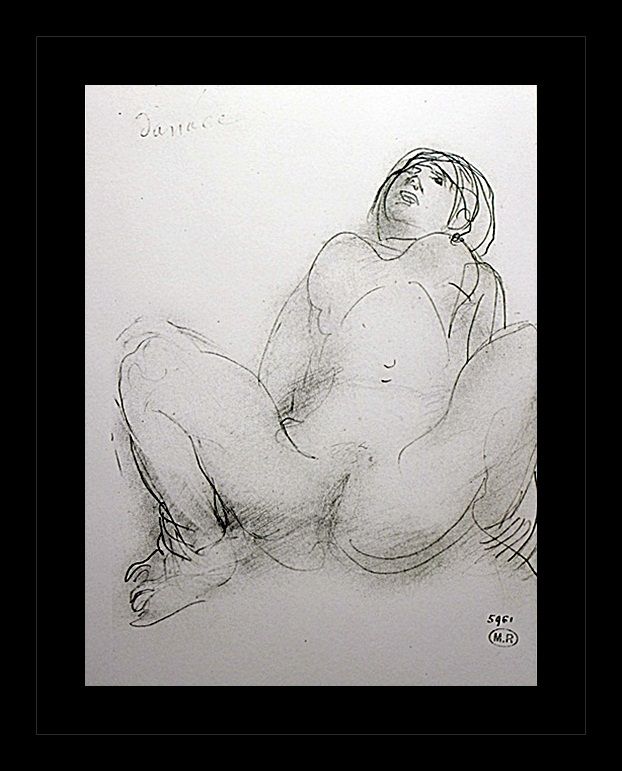 Erotic sketch lithograph by Auguste Rodin titled, "Danae". The original pencil paper was undated. Comes gallery framed black on black.
