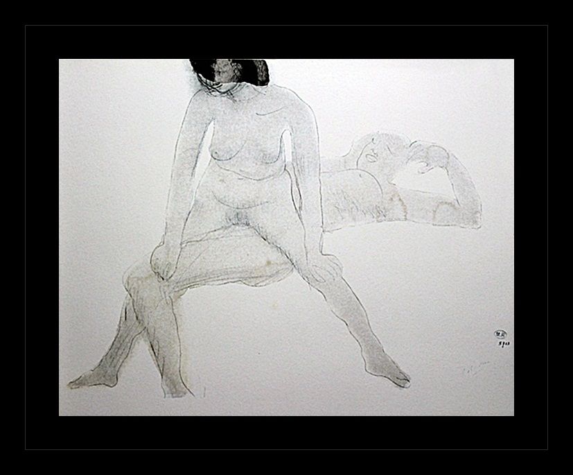 Erotic sketch lithograph by Auguste Rodin titled, "Sapphie Couple". The original pencil and watrcolor on paper is from an unknown date. Comes gallery framed black on black.