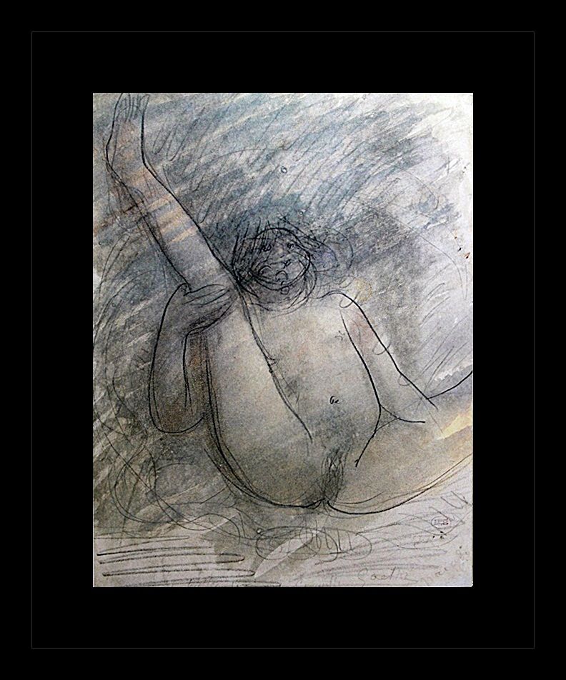 Erotic sketch lithograph by Auguste Rodin titled, "Neiad". The original was pencil and watercolor on paper, date unknown. Comes gallery framed black on black.