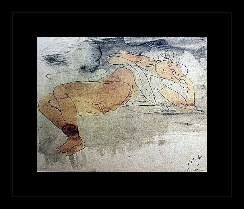 Erotic sketch lithograph by Auguste Rodin titled, "La Leune, Psyche". The original was pencil on paper, date unknown. Comes gallery framed black on black.