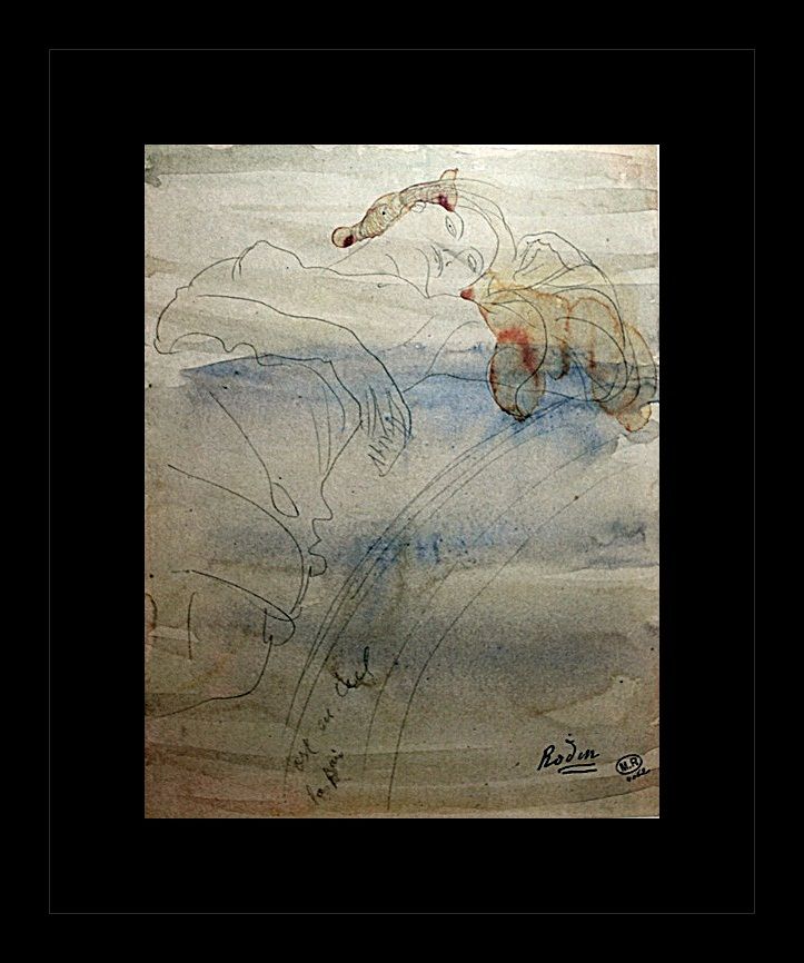 Erotic sketch lithograph by Auguste Rodin titled, "Are-en-ciel". The original was pencil, watercolor and gouache on paper. Comes gallery framed black on black.