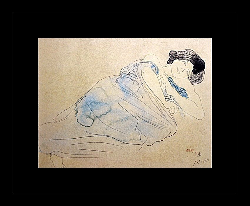 Erotic sketch lithograph by Auguste Rodin titled, "Woman Dressed, Lying on Her Side". The original was pencil, watercolor and gouache on paper. Comes gallery framed black on black.
