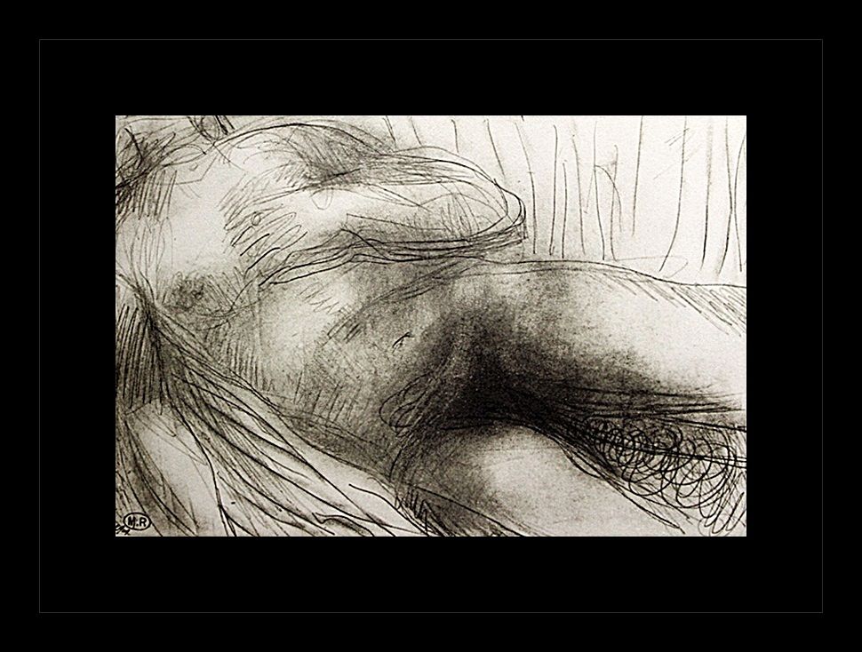 Erotic sketch lithograph by Auguste Rodin titled, "Reclining Female Torso, Hand on Breast". The original was pencil on paper. Comes gallery framed black on black.