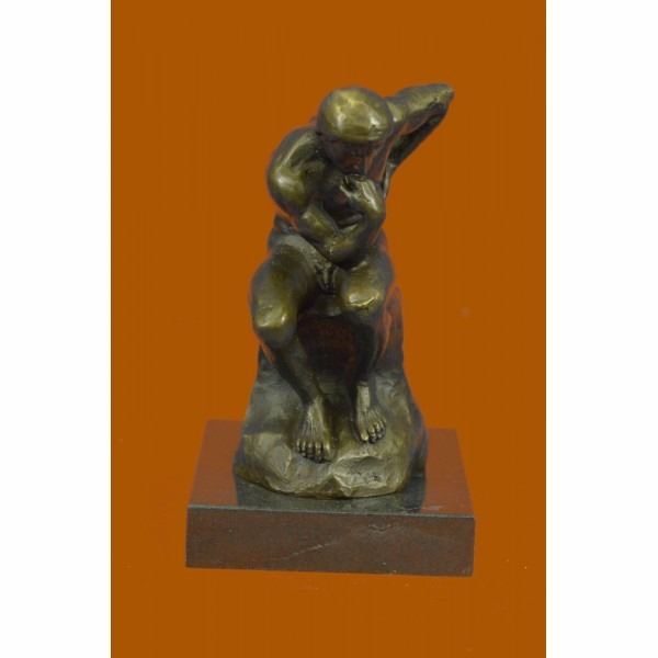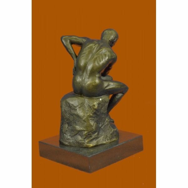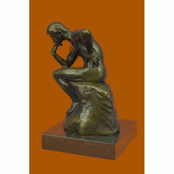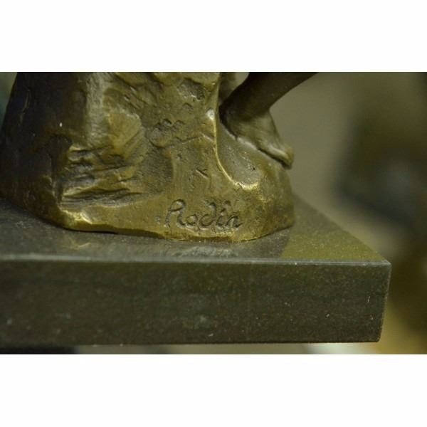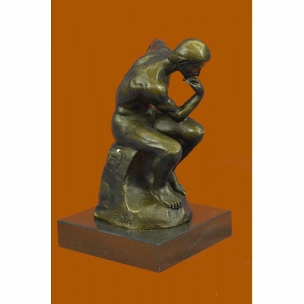 Often used as a symbol of Philosophy Rodin's "Thinker" depicts a man in deep thought is quite popular across the world. The man is deep in thought contemplating an internal conflict that has been plaguing his mind. He is leaning on his right fist with his left arm laying on his thighs while sitting on a large rock. The detail in this piece highlights the man's musculature and facial features. The classic bronze sculpture was cast using the lost wax method. It rests on a black marble base. It is signed Rodin. Condition: This sculpture is in perfect condition. Bronze Dimensions with Marble Base:Height 5.5" x Width 3.25" Marble Dimensions: 3" X 3" Height without base: 4.5" Weight : 3 LBS Inventory : 23EP99932