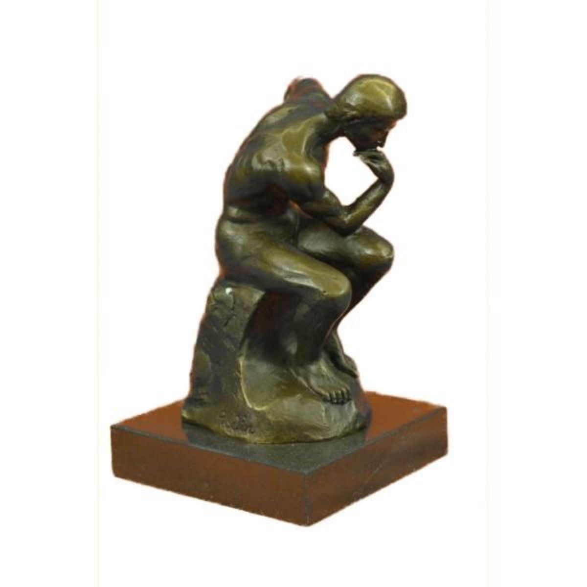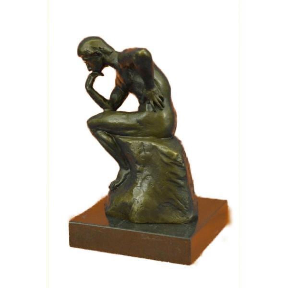 Often used as a symbol of philosophy Rodin's "Thinker" depicts a man in deep thought is quite popular across the world. The man is deep in thought contemplating an internal conflict that has been plaguing his mind. He is leaning on his right fist with his left arm laying on his thighs while sitting on a large rock. The detail in this piece highlights the man's musculature and facial features. The classic bronze sculpture was cast using the lost wax method. It rests on a black marble base. It is signed Rodin. Condition: this sculpture is in perfect condition. Bronze dimensions with marble base:height 5.5" x width 3.25" Marble dimensions: 3" x 3" Height without base: 4.5" Weight : 3 lbs