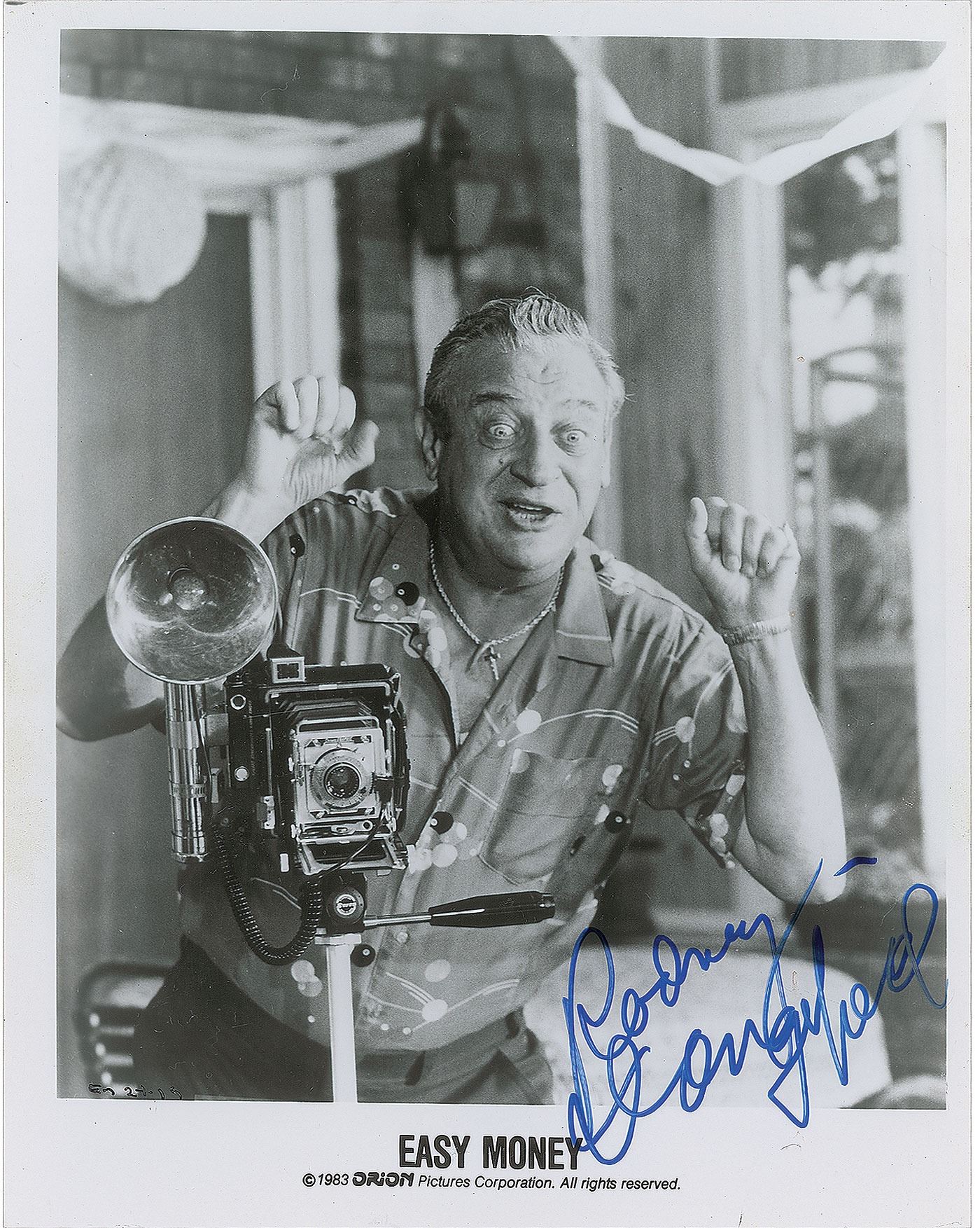Glossy 8 x 10 Orion Pictures publicity photo of Dangerfield as Monty Capuletti from the 1983 comedy Easy Money, signed in blue felt tip. In fine condition. From the Harvey and Rhoda Kuflik Collection.
