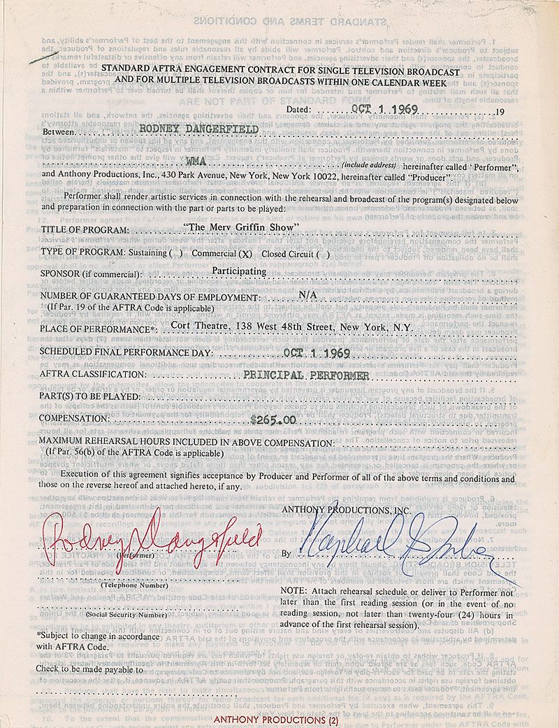 DS, one page, 8.5 x 11, October 1, 1969. Standard AFTRA contract in which Dangerfield agrees to appear on The Merv Griffin Show on the same day in exchange for $265. Signed at the conclusion in red ballpoint by Dangerfield. A standard AFTRA rider is stapled to the main document in the upper left. In fine condition, with expected document wear.