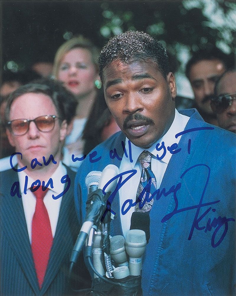 Color glossy 8 x 10 photo of King at a 1992 press conference, signed in-person in blue felt tip, “Can we all get along, Rodney King.” In fine condition. Originally obtained by in-person specialist Mike Wehrmann.