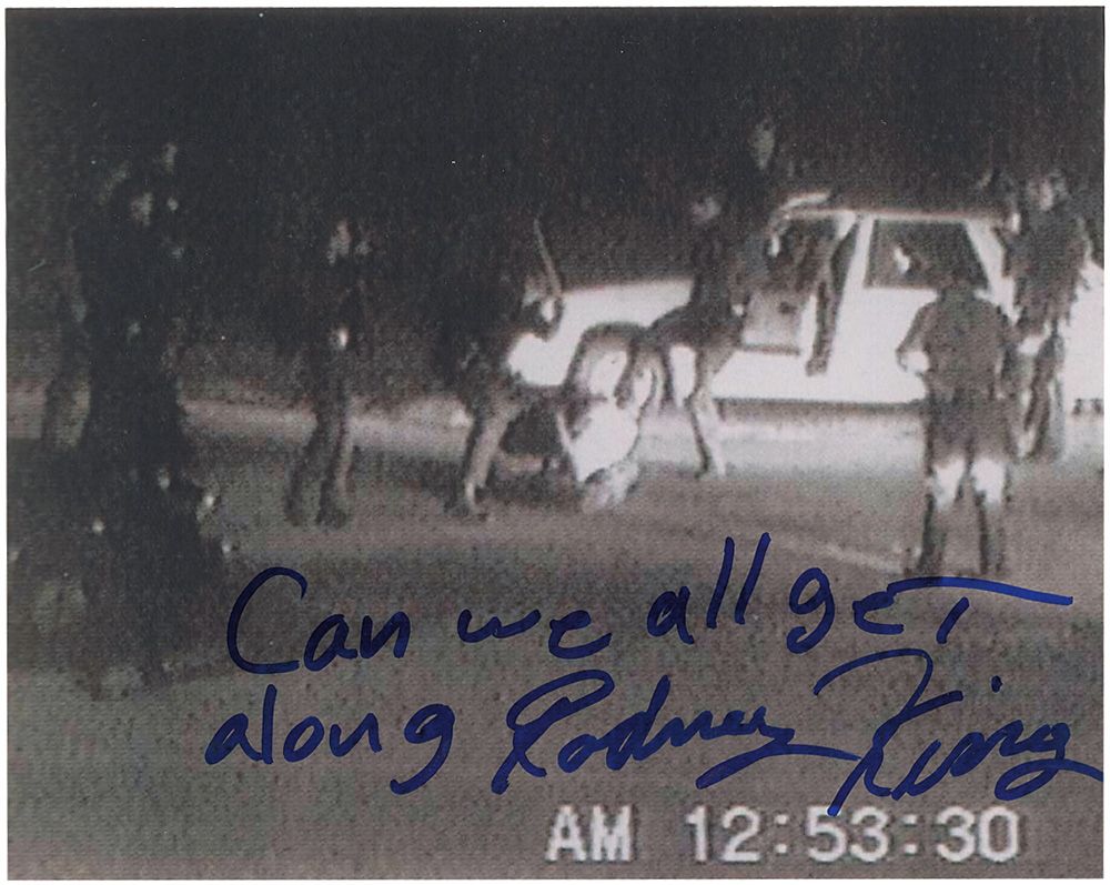 Glossy 10 x 8 photo of King’s beating by the Los Angeles Police Department, signed in-person in blue felt tip, “Can we all get along, Rodney King.” In fine condition. Originally obtained by in-person specialist Mike Wehrmann.