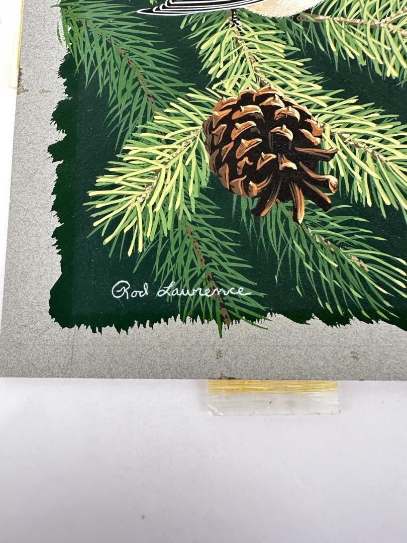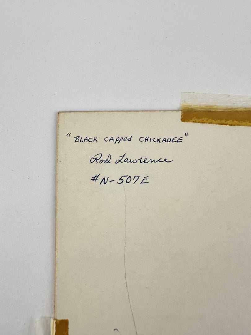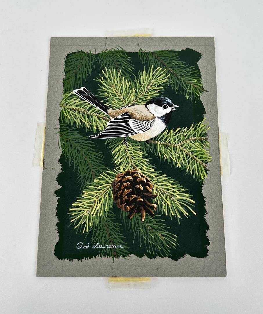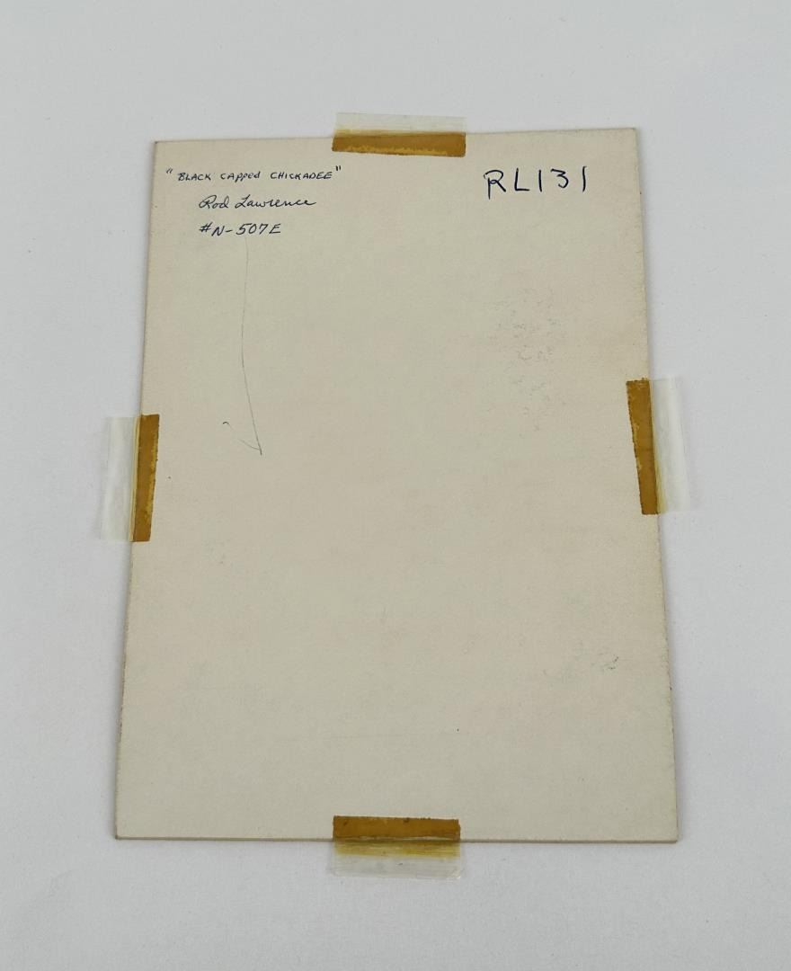 Black Capped Chickadee. 7 3/8" by 5 1/2". Gouache. Rodney Steven Lawrence (Born 1951) is active/lives in Michigan. Rodney Lawrence is known for Wildlife, stamp designs. A magna cum laude graduate with a fine-arts degree from the University of Michigan, Rodney Lawrence is a full-time artist known for wildlife images. Some of those images have appeared on Michigan postage stamps.