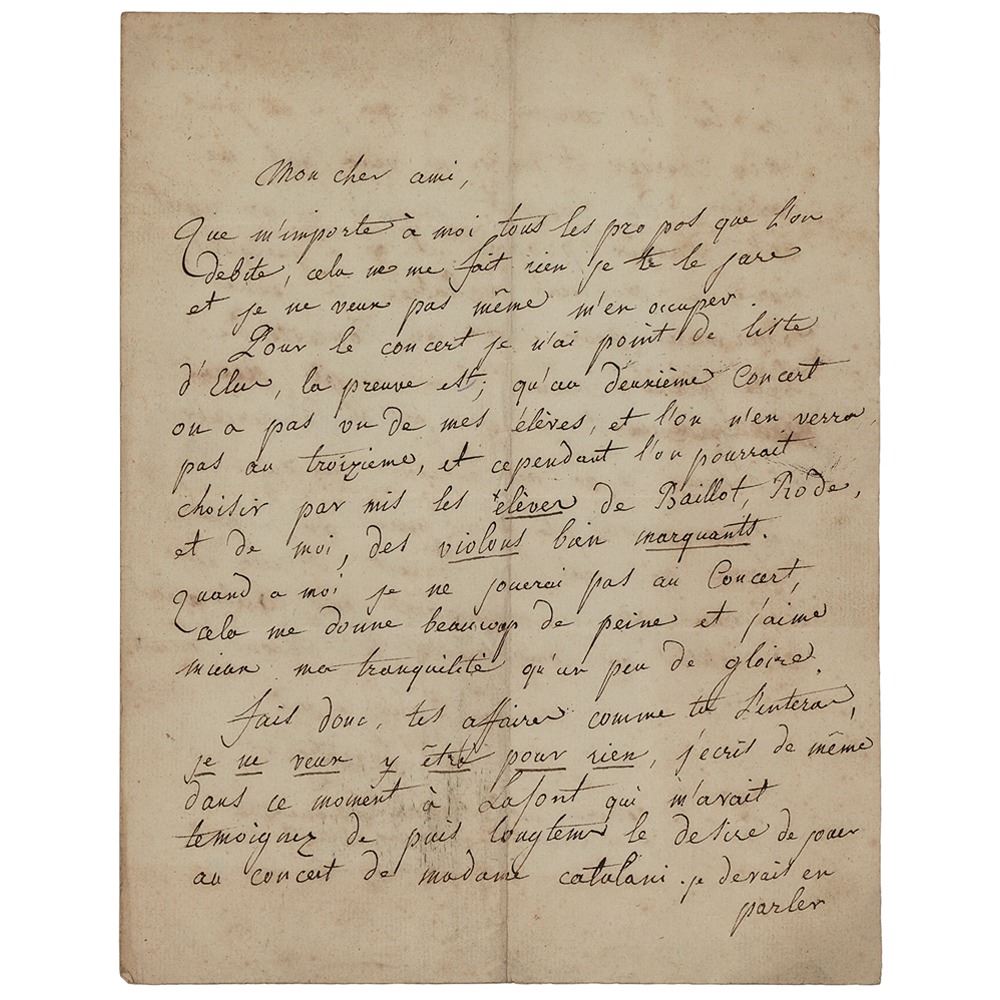 Rare ALS in French, signed “Kreutzer,†one page both sides, 7.5 x 9.5, no date. Untranslated handwritten letter to the violinist Alexandre Boucher, regarding plans for a concert. In fine condition, with intersecting folds and light soiling.