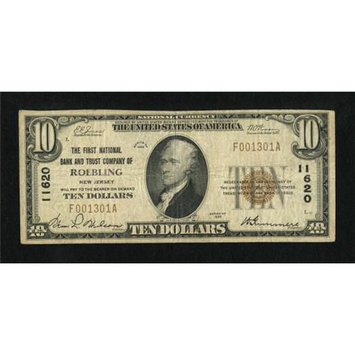 <B>Roebling, NJ</B></I> - $10 1929 Ty. 1 <B>The First NB & TC</B></I> Ch. # 11620<BR> Bearing the second title used by the only bank in this Burlington County community, this note is a problem free <B>Fine</B></I>.<BR><BR><b>Shipping:</b> Coins & Currency (<a target="_blank" href="http://www.heritageauctions.com/common/shipping.php">view shipping information</a>)