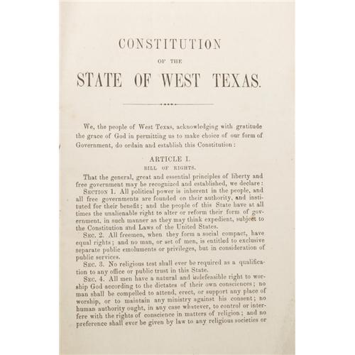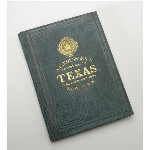 <B>, Anton R. Roessler. A. R. Roessler's Latest Map of the State of Texas</B></I>…New York: Edw. Welcke, 1874. 96.2 x 106.2 cm. Colored. Folded into original green cloth with title in gilt on front cover. Minor splitting. A fine copy. First edition. Taliaferro Cartographic Sources in the Rosenburg Library 349: "Rosessler's maps are the only printed maps that preserve the results of the Shumard survey, the state's first geological and agricultural survey." This large, splendid production contains illustrations of the Old State Capital Building and the General Land Office. There is an inset map entitled: Map Showing Agricultural and Varieties of Soils in the State of Texas 28.5 x 28.8 cm. This depicts the disputed Greer County as part of Texas. Roessler was one of those controversial self-promoters who seem to flourish in Texas. Roessler was a trained geologist and worked on the Texas Geological Survey in the 1860s and was involved with the Texas land and Immigration Co., of New York in the 1870s. He was accused of many misdeeds but his maps are the best contemporary records of agricultural and mineral wealth. A good portion of New Mexico is depicted. A remarkably fine map showing counties, county seats, towns, roads, streams, rivers, mountains, location of Indian tribes in Indian Territory, public lands, remarks on topography, notes on treaty cessions, etc. Plus six insets. Scale an inch to 20 miles. <I>Courtesy of Michael Heaston, Austin.</B></I> Consigned Lot <BR><BR><b>This 2006 March Texas State Historical Association Charity Auction is being held in Austin, TX on February 12 - March 4, 2006. This is a charity auction. All proceeds from donated lots in the auction, commissions from consigned lots, and the buyer's premium go solely to the Texas State Historical Association. The floor auction session is by invitation only. Online bidding ends March 3, 2006 at 10:00PM CT. Your secret maximum bid will compete for you during the floor auction, and it is possible that you may be outbid on the floor after internet bidding closes. The applicable buyer's premium for this auction is an amount equal to 15% (minimum $9 per lot) of the successful bid on ebay. State law requires lots consigned (not donated) to THSA collect full sales tax on items that sell for a total of $5,000 or more. </b>