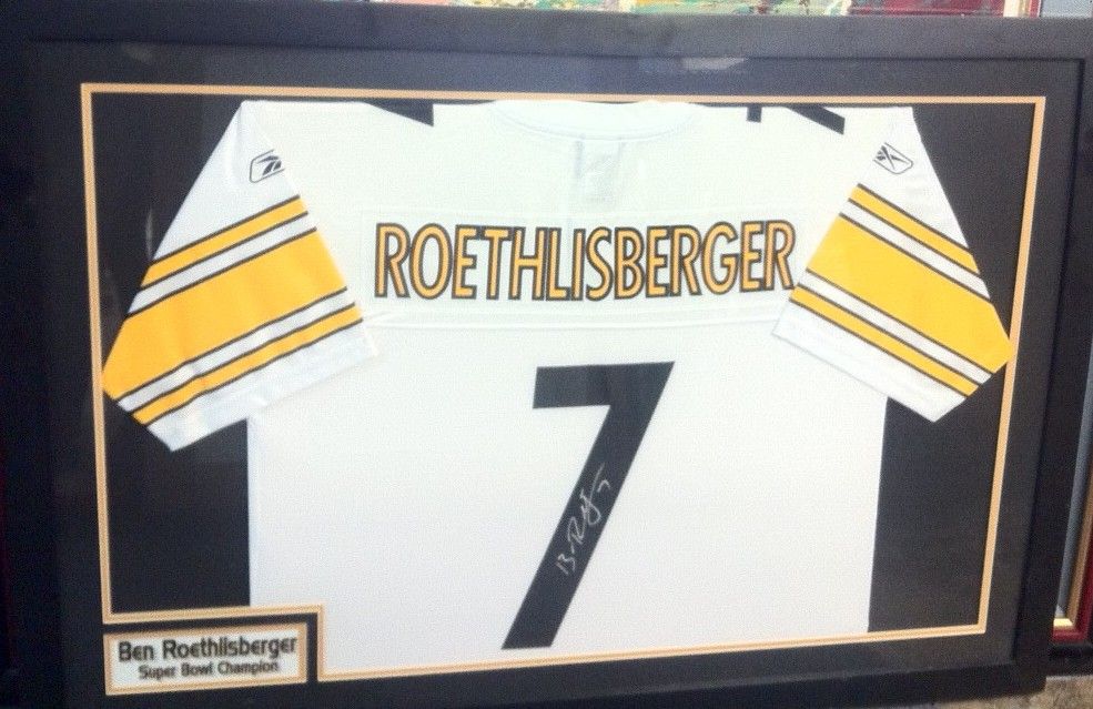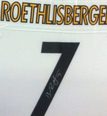 Number 7 jersey framed and autographed by Ben Roethlisberger Super Bowl Champion. Certificate of Authenticity on back, by Playball Sports. 30"W x 43"H