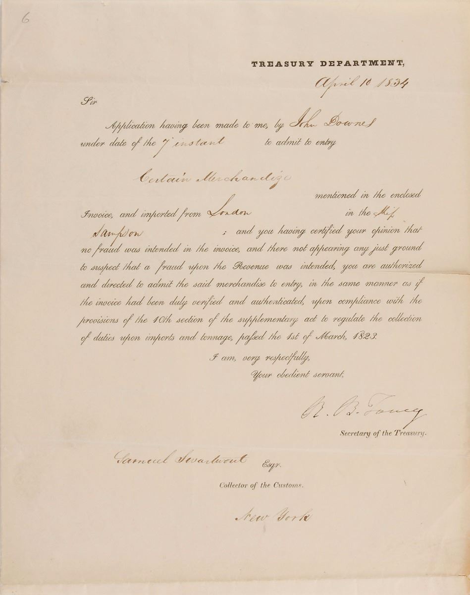 TLS signed “R. B. Taney,” one page, 7.75 x 9.75, Treasury Department letterhead, April 10, 1834. Letter to Samuel Swartswout, the collector of customs in New York, in part: “Application having been made to me, by John Downes under date of the 7 instant to admit to entry Certain Merchandize mentioned in the enclosed Invoice, and imported from London in the Ship Sampson; and you having certified your opinion that no fraud was intended in the invoice, and there not appearing any just ground to suspect that a fraud upon the Revenue was intended, you are authorized and directed to admit the said merchandize to entry, in the same manner as if the invoice had been duly verified and authenticated.” In fine condition, with splitting along one of the horizontal folds.