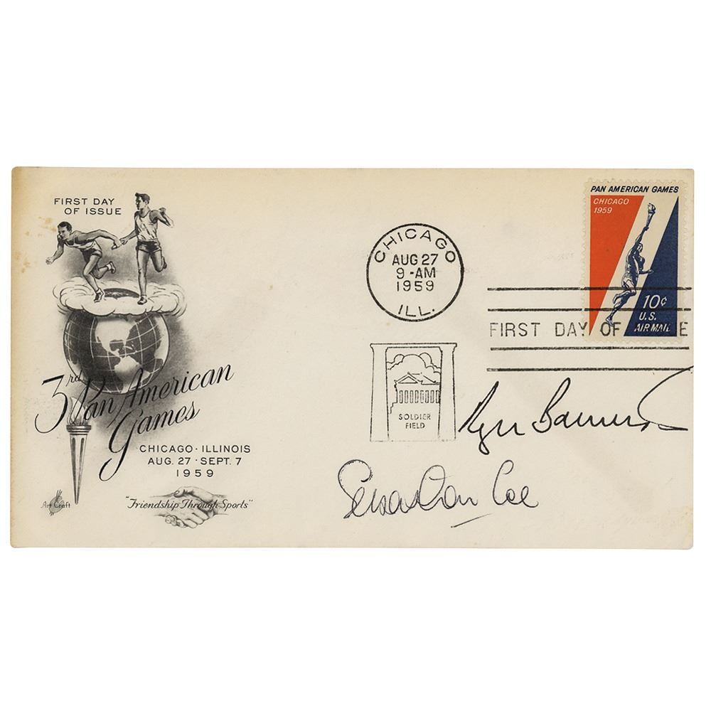 FDC with a cachet honoring the 3rd Pan American Games, signed in black ink by celebrated British middle-distance runners Roger Bannister and Sebastian Coe. In fine condition, with light toning.