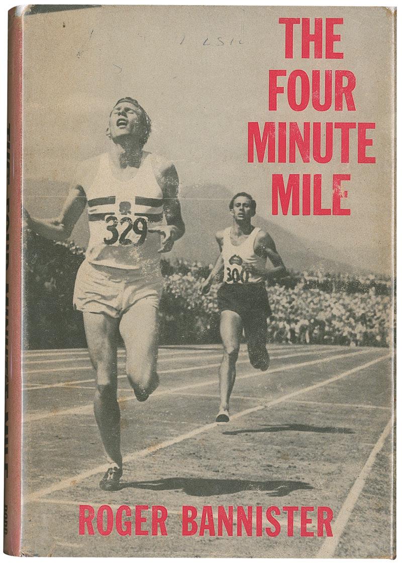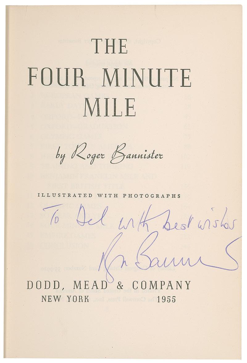 Signed book: The Four Minute Mile. First edition. NY: Dodd, Mead and Company, 1955. Hardcover with dustjacket, 5.5 x 8.25, 252 pages. Signed and inscribed on the title page, “To Del with best wishes, Roger Bannister.” In very good condition, with toning and foxing to both pastedowns and opening pages, pencil notations to first free end page, and toning, creasing, and ink notations to dustjacket.