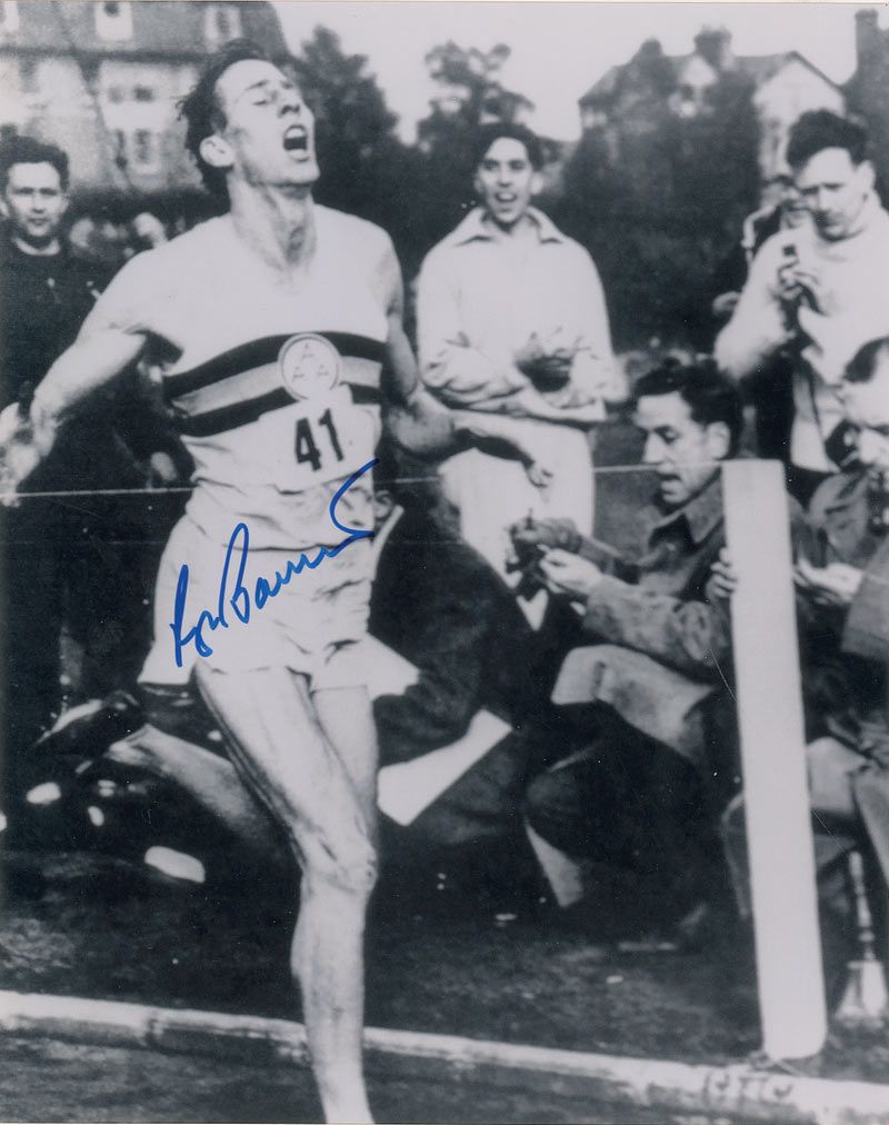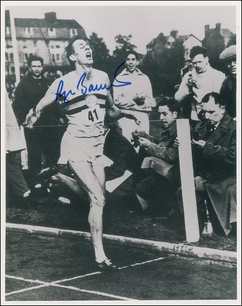 Two glossy 8 x 10 photos of an exhausted Bannister breaking the tape as he breaks the four-minute mile, each signed in blue felt tip. In fine condition.