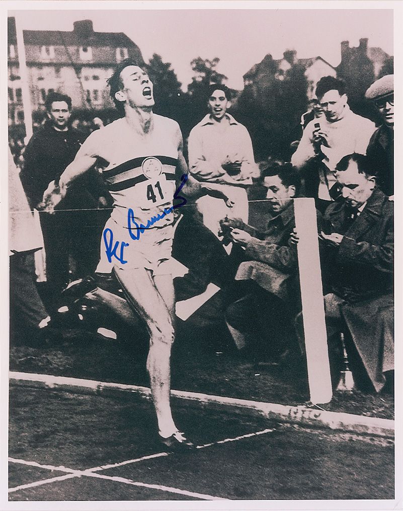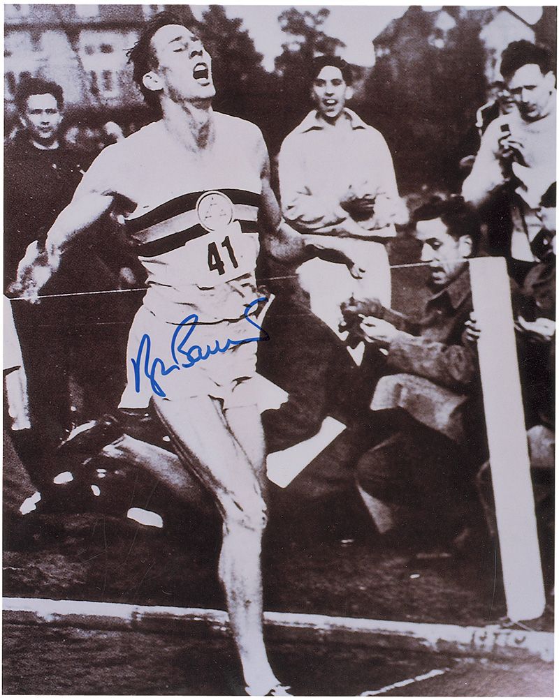 Two identical 8 x 10 photos, one glossy and one satin-finish, of Bannister crossing the tape after breaking the four-minute mile, each signed in blue felt tip. In fine condition.