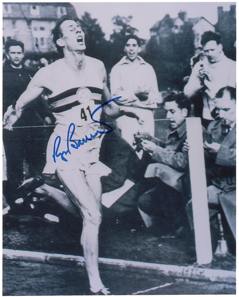 Historic satin-finish 8 x 10 photo of Bannister crossing the tape after breaking the four-minute mile, signed in blue felt tip. In fine condition.