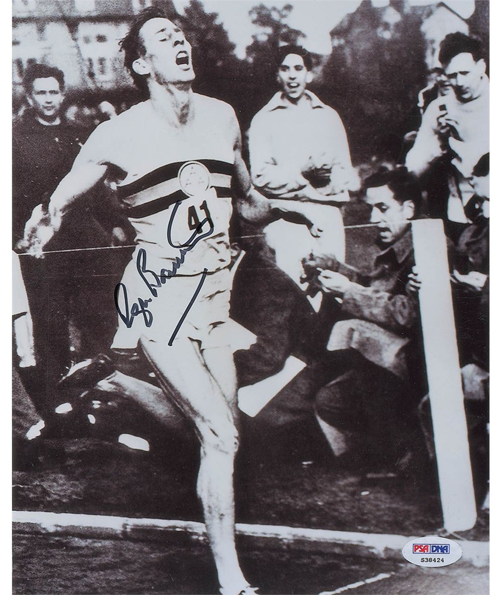 Glossy 8 x 10 photo of Bannister crossing the tape after breaking the four-minute mile, signed in black felt tip. In fine condition, with some spotting to the upper right and a PSA/DNA label affixed to the lower right corner.