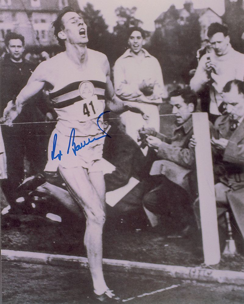 Satin-finish 8 x 10 photo of Bannister crossing the tape after breaking the four-minute mile, signed in blue felt tip. In fine condition.