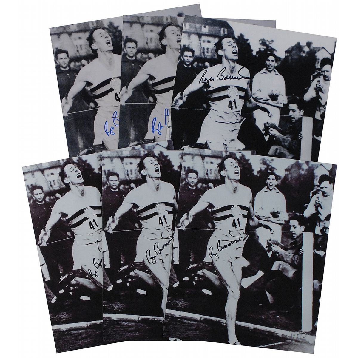 Six 8 x 10 photos of various finishes showing Bannister crossing the tape after breaking the four-minute mile, each signed in blue or black felt tip. In overall fine condition.