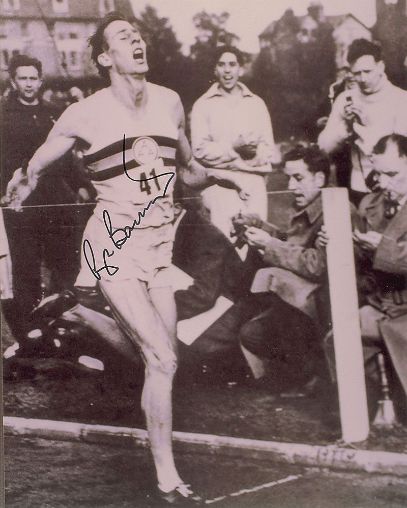 Two identical satin-finish 8 x 10 photos of Bannister crossing the tape after breaking the four-minute mile, each signed in black felt tip. In very fine condition.