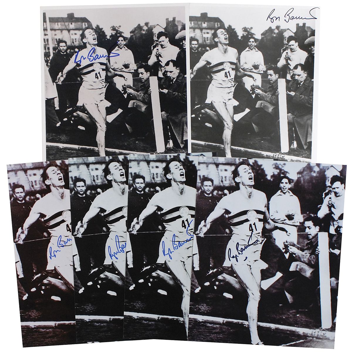 Group of six glossy and satin-finish 8 x 10 photos of Bannister breaking the four-minute mile, each signed in blue or black felt tip. In fine condition.