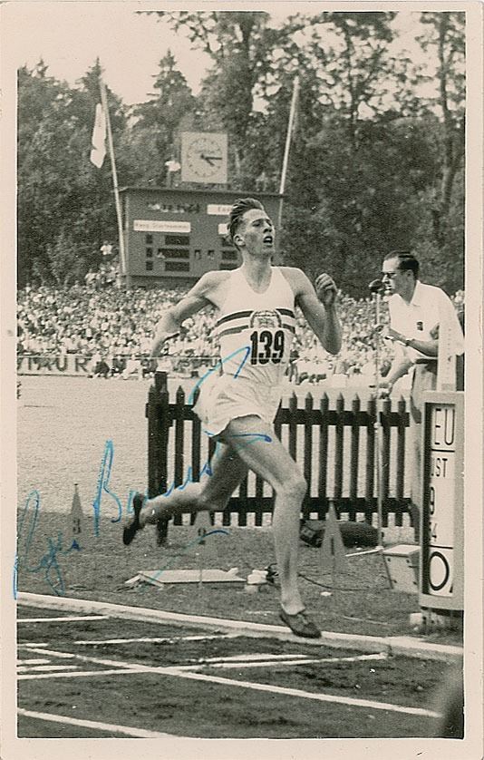 Vintage pearl-finish 3.5 x 5.5 full-length photo of Roger Bannister sprinting at the Empire Games in 1954, signed in blue fountain pen. In fine condition, with a light paperclip impression to the top edge. Accompanied by a transmittal letter from Bannister's father to the recipient, dated March 29, 1955, in part: "We have already had several letters from you and I have already sent you a photograph of my son. I cannot keep doing this but I am sending you another one—which will be the last—whether you receive it or not, as my patience is exhausted, and I do not see why we should be put to this expense. My son thanks you for your good wishes."