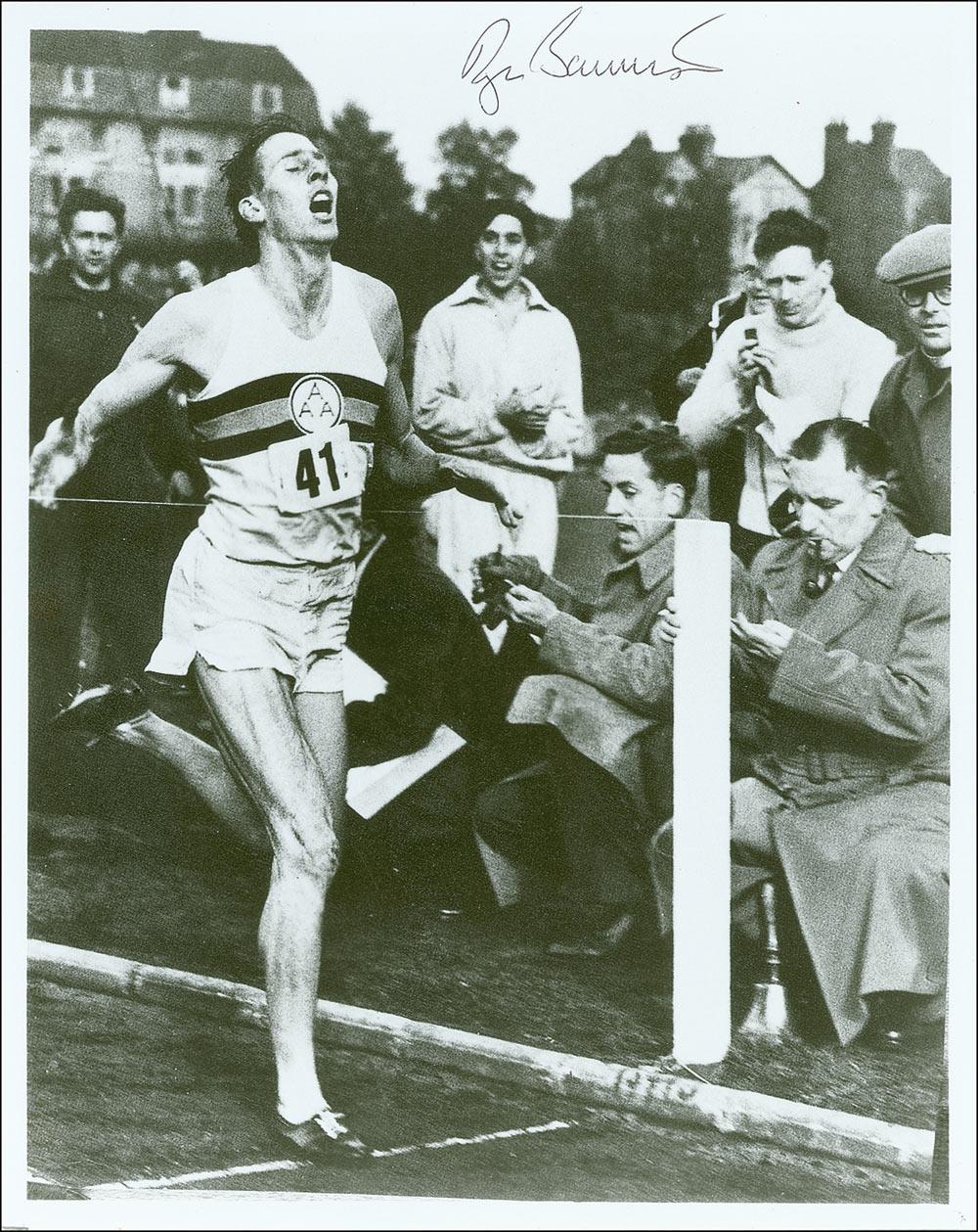 Glossy 8 x 10 photo of Bannister breaking the tape at the conclusion of the four-minute mile, signed in black ballpoint. In fine condition.