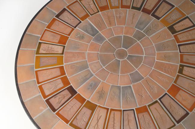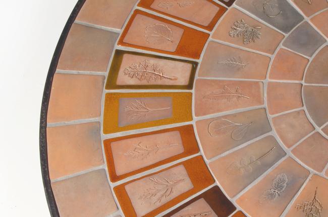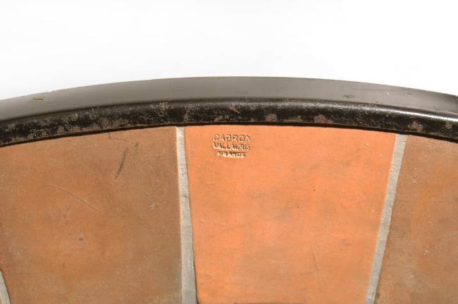 15h x 35dia inches, glazed and enameled ceramic tiles with imprinted flower decoration, steel frame, perfect condition
