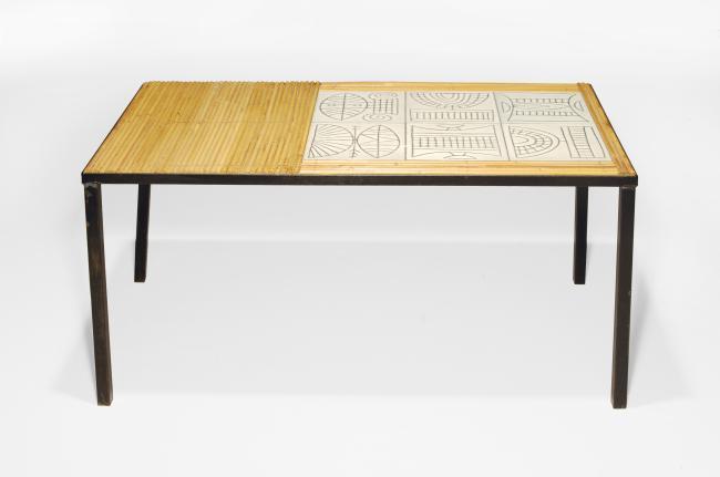 17.5h x 31.5 x 15.5d inches, black enameled steel, bamboo, glazed ceramic tiles with primitive design, original very good condition