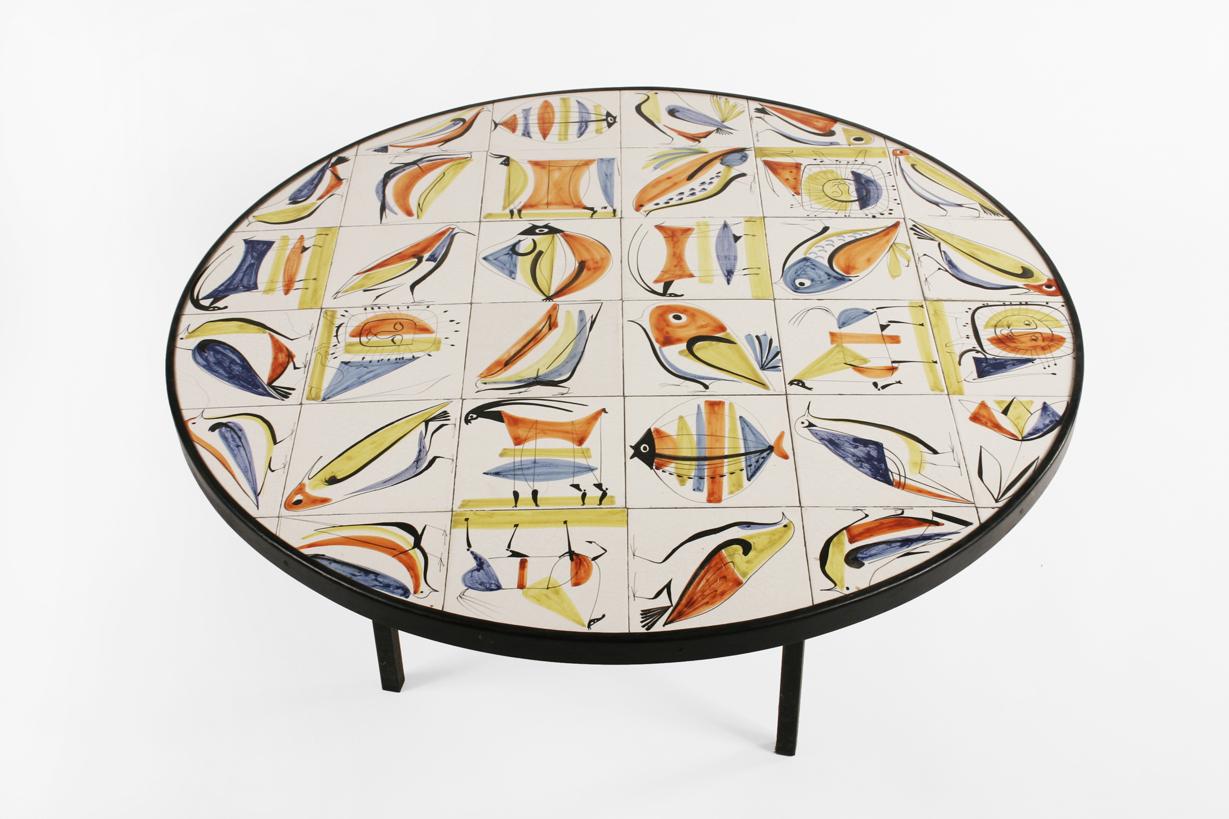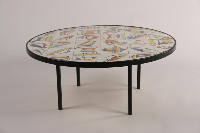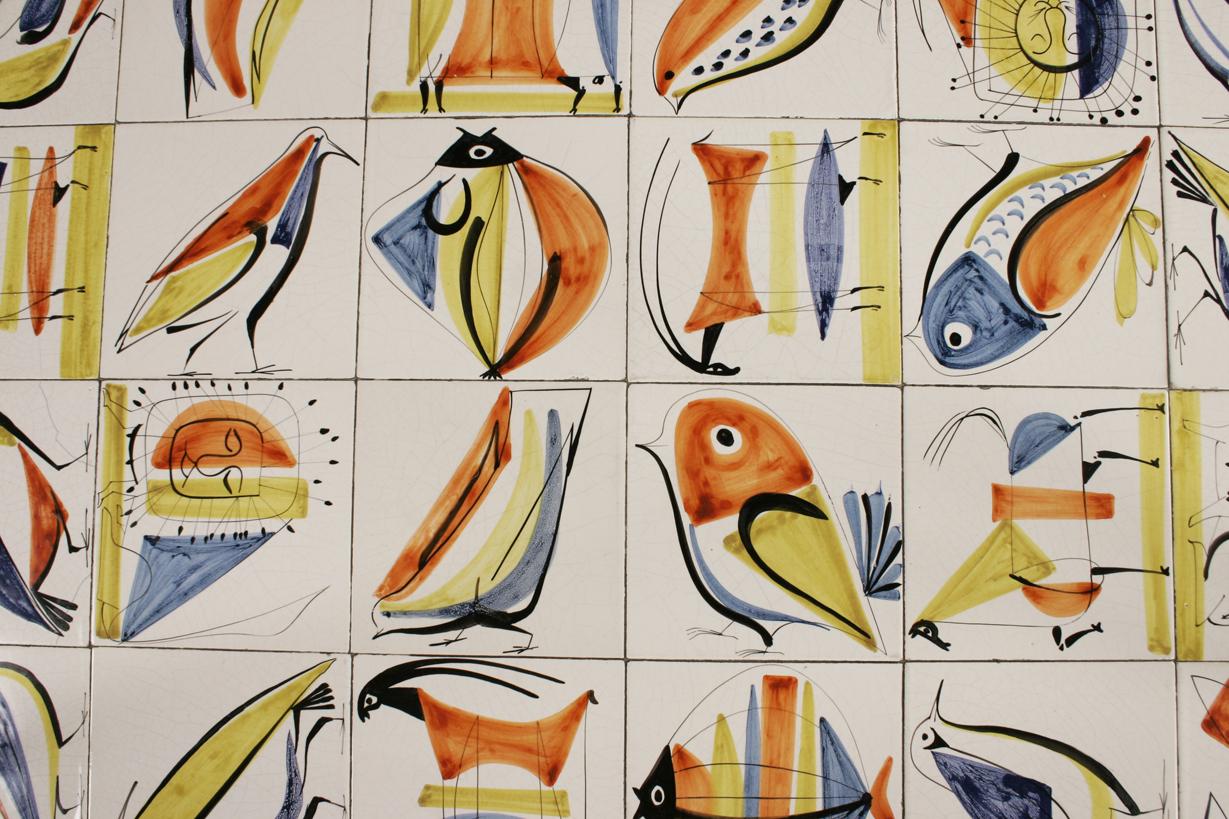15h x 36d inches, hand painted ceramic tiles with birds, fishes and rams