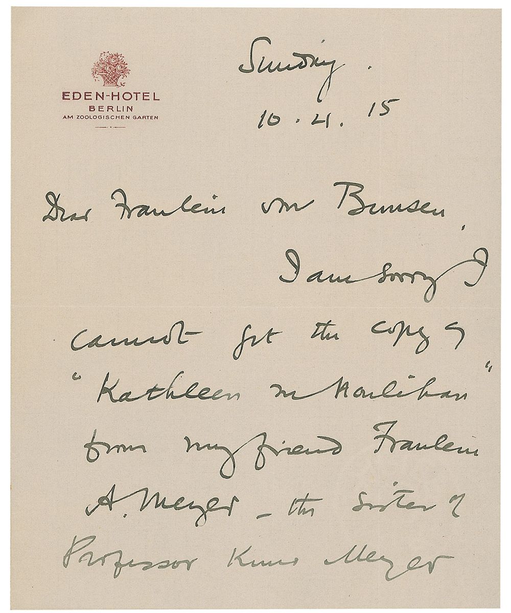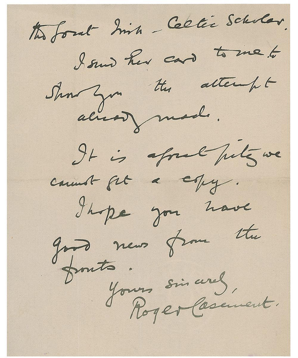 Irish nationalist, activist, and poet (1864–1916) who was executed for treason following the Easter Rising. Scarce ALS, two pages on two adjoining sheets, 6.25 x 7.75, Eden-Hotel Berlin letterhead, April 10, 1915. Letter to Franklin von Bunsen. In full: “I am sorry I cannot get the copy of ‘Kathleen ni Houlihan’ from my friend Fraulein A. Meyer—the sister of Professor Kuno Meyer the great Irish-Celtic scholar. I send her card to me to show you the attempt already made. It is a pity we cannot get a copy. I hope you have good news from the fronts.” In fine condition, with intersecting folds. Casement went to Germany in 1914 at the outbreak of WWI, and was able to negotiate an agreement by which Germany would not invade Ireland, should the war spread to its shores. During the rest of his time in Germany he attempted to recruit an ‘Irish Brigade,’ comprised of Irish prisoners-of-war from the prison camp of Limburg an der Lahn, to fight against the British. This plan failed, however, and Casement went on to try and arrange a large arms shipment from Germany to his countrymen—this too failed, when the ship was intercepted on its way. He returned to Ireland and was arrested just before the Easter Rising, and was controversially convicted and sentenced to death under an ambiguous medieval law. Of particular note, Casement mentions Kathleen Ni Houlihan, a nationalist symbol representing Ireland personified and most notably used in a one-act play written by William Butler Yeats and Lady Gregory in 1902—most likely what Casement desired a copy of. A fantastic letter with significant connections to Casement’s life and work, as well as the Irish nationalist movement itself.