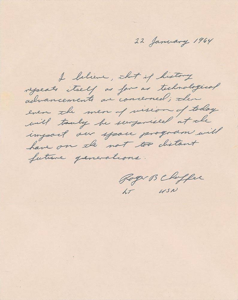 Rare autograph statement, signed "Roger B. Chaffee, Lt., USN," one page, 8 x 10, January 22, 1964. In full: “I believe that if history repeats itself as far as technological advancements are concerned, then even the men of vision of today will truly be surprised at the impact our space program will have on the not too distant future generations.” In fine condition. Although Chaffee sadly perished in the Apollo 1 fire, this letter foretells the enormous impact of America's space program which he would not live to see. Between the direct development of innovative technologies by NASA and the inspiration brought about by space exploration, future generations have benefitted enormously by the work of Chaffee, his fellow astronauts, and all the engineers and personnel that made America's space program enormously successful.