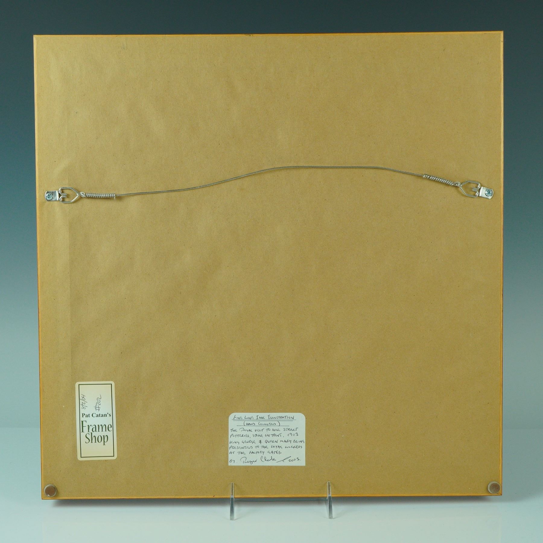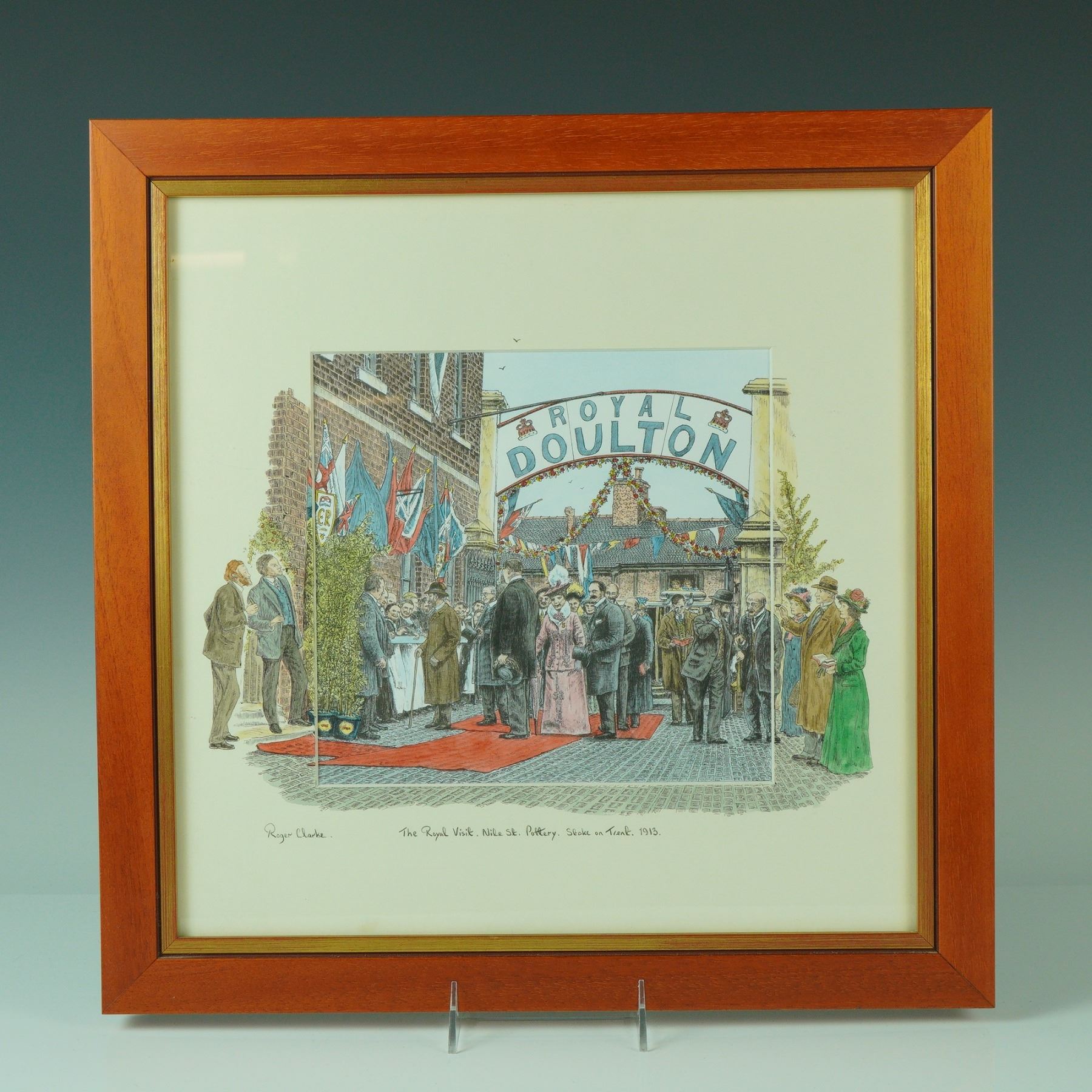 Fine line ink illustration print by Roger Clarke titled "The Royal Visit. Nile St. Pottery. Stoke on Trent. 1913", depicting King George V and Queen Mary arriving at the Royal Doulton factory gates during their 1913 visit. Workers are shown gathered in respectful formation beneath celebratory bunting and a boldly lettered "Royal Doulton" arch. The central image is printed in fine line ink and delicately hand colored, while the composition continues onto the surrounding mat, where additional detailing has been hand drawn directly onto the surface. Clarke's signature appears at lower left, and the title is inscribed across the center of the lower mat. Dated 2003.