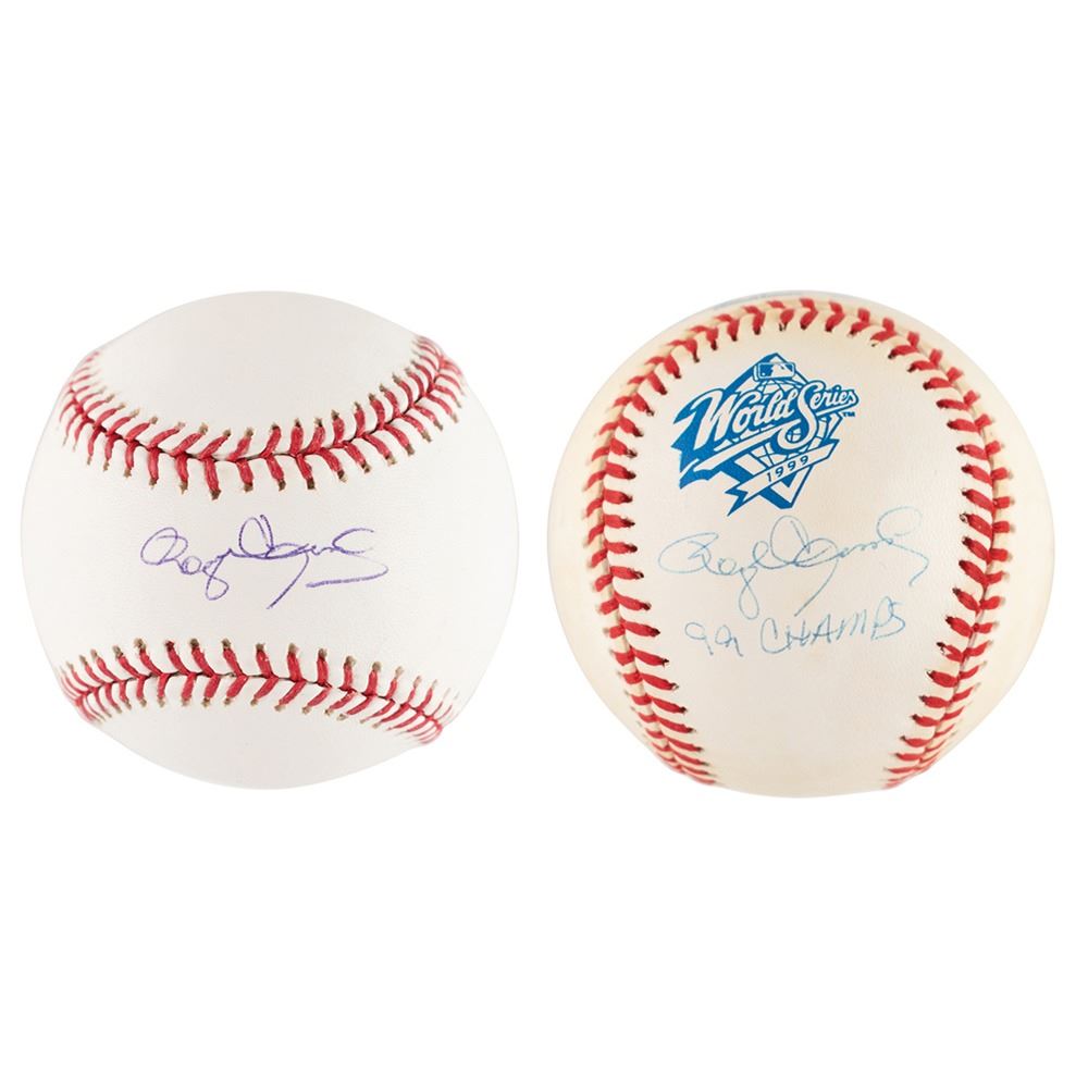 Two official Rawlings Major League (Selig) baseballs: a 1999 World Series baseball, signed on a side panel in blue ballpoint, "Roger Clemens, 99 Champs"; and a baseball signed on the sweet spot in blue ballpoint, "Roger Clemens." In overall fine condition, with light toning to the World Series baseball, and Steiner and Mounted Memories holograms affixed to the other ball. Clemens won the deciding Game 4 in the Yankees' 1999 World Series sweep of the Atlanta Braves, surrendering just one run over 7.2 innings pitched.