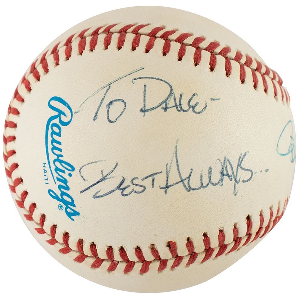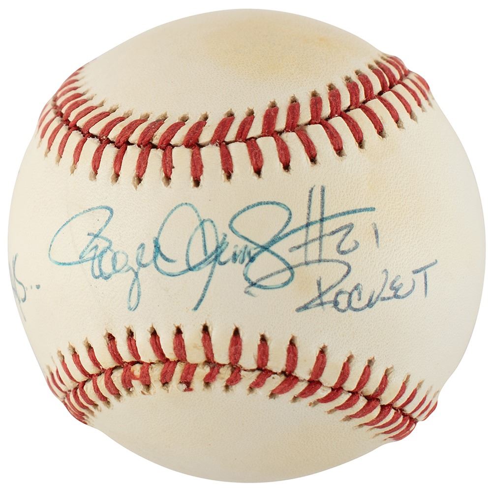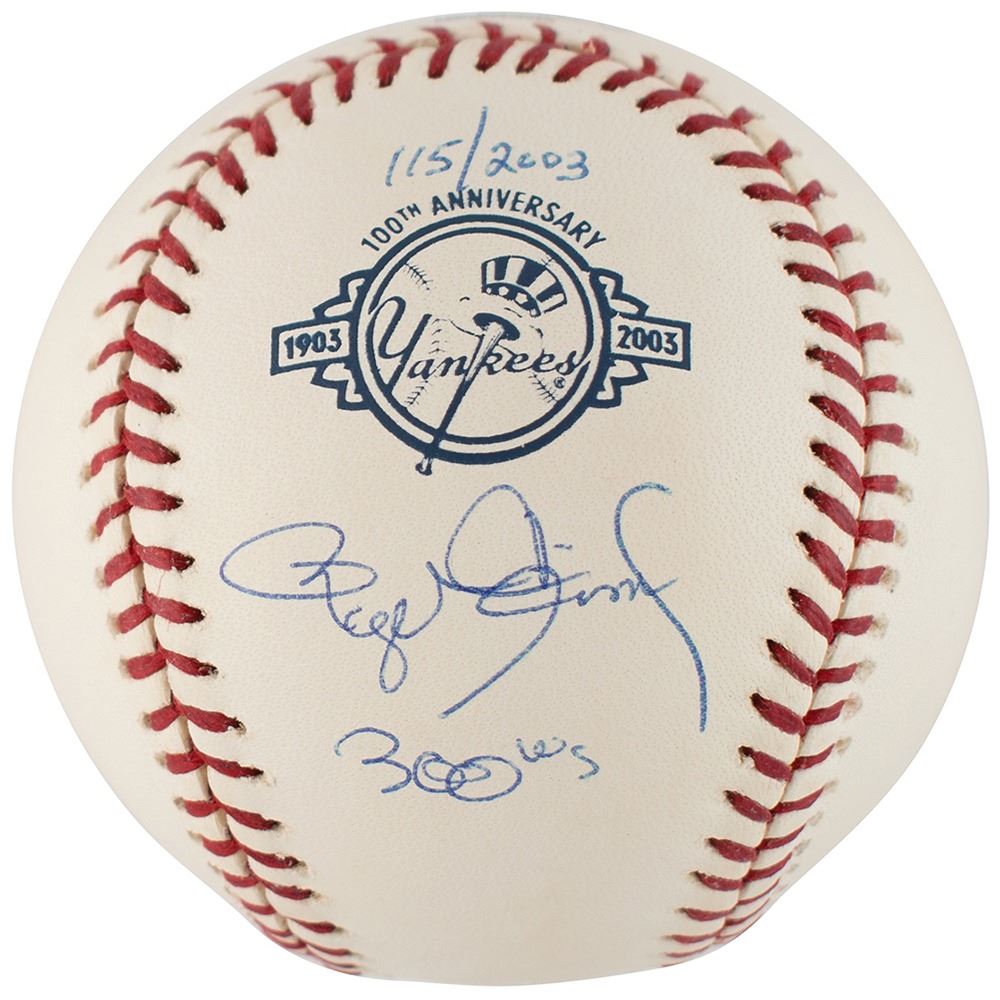Two official Rawlings baseballs signed by Roger Clemens: an American League (Brown) ball signed on the sweet spot in blue ballpoint by Clemens, with another hand adding an inscription and his number to the side panels in black ballpoint; and a limited edition Major League (Selig) ‘Yankees 100th Anniversary' ball, numbered 115/2003 in an unknown hand, signed on a side panel in black ballpoint by Clemens, who adds “300 wins.†In overall fine condition, with some toning to the inscribed ball and an authenticity label affixed to rear of the anniversary ball.