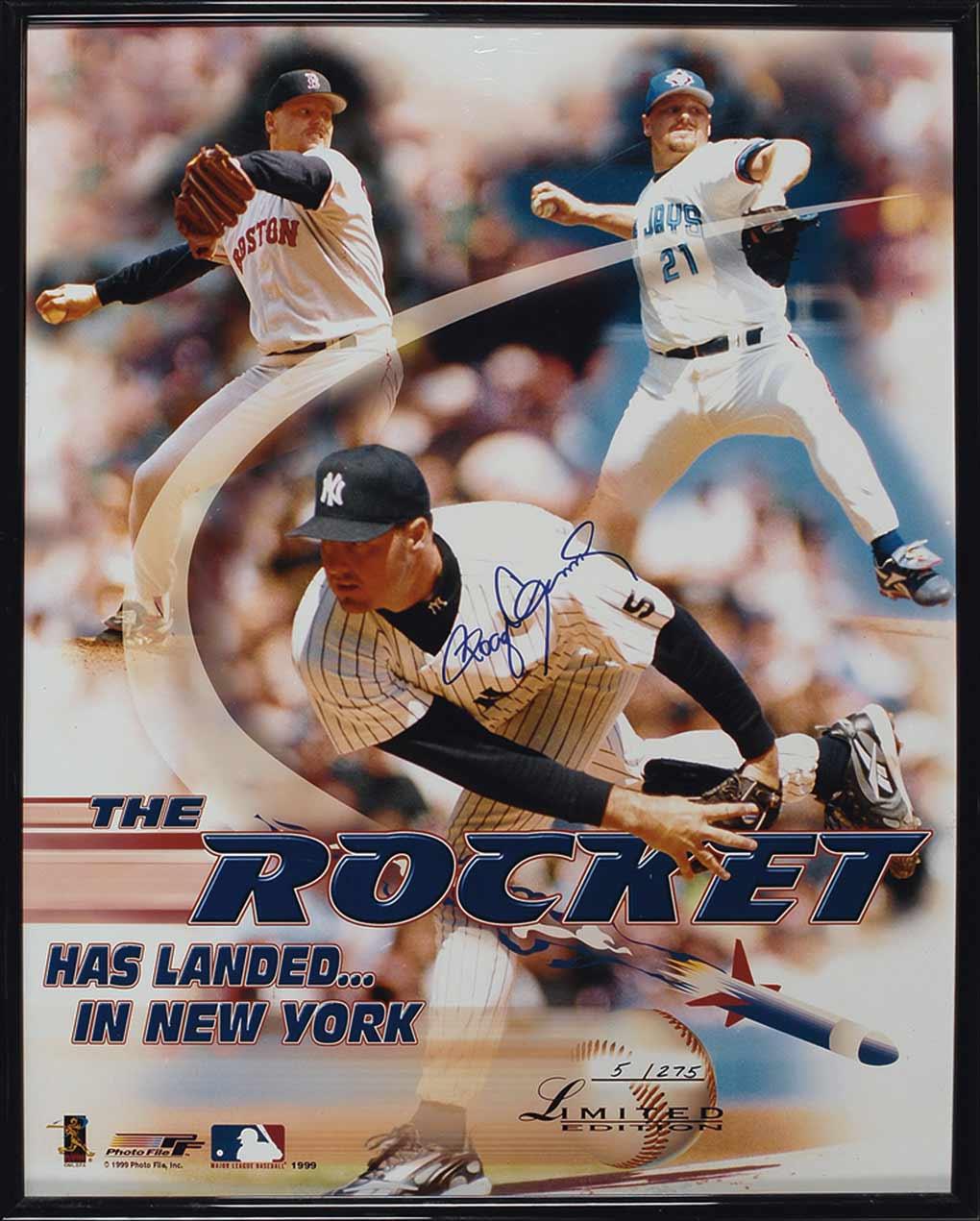 Limited edition color glossy 15.5 x 19.5 composite photo announcing “The Rocket has landed in New York,” #5/275, signed in blue felt tip. Framed to an overall size of 16.5 x 20.5. In very fine condition.