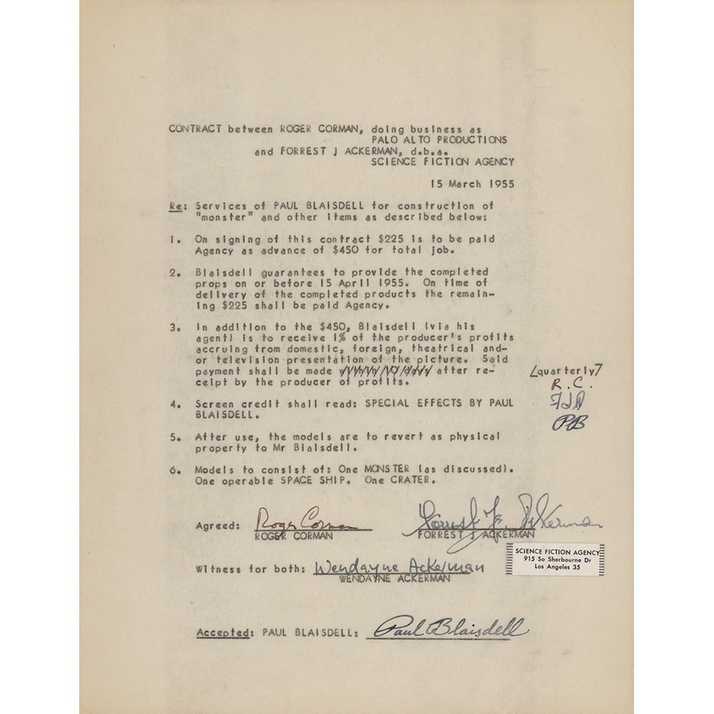 DS, one page, 8.5 x 11, March 15, 1955. Contract between Roger Corman, doing business as Palo Alto Productions, and Forrest J. Ackerman with the Science Fiction Agency, regarding the employment of special effects artist Paul Blaisdell, who will be required to create models of "One MONSTER," "One operable SPACE SHIP," and "One CRATER." Signed at the conclusion by Corman and Ackerman, and countersigned below by Blaisdell and by Ackerman's wife Wendayne as a witness. Corman, Ackerman, and Blaisdell add their initials in the right margin. In fine condition. A terrific assemblage of notable cinema and science-fiction heavyweights connected to either Corman's The Beast with a Million Eyes or Day the World Ended, which were both released in 1955.