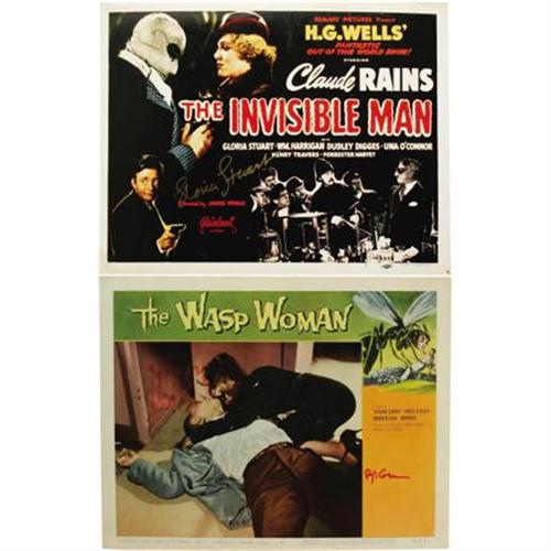 <B>Roger Corman and Gloria Stuart Signed Lobby Cards.</B></I> Pair of 11" x 14" lobby cards, one for <I>The Wasp Woman</B></I> (1960) signed by Roger Corman in red marker (with "Yum Yum" added by an unknown hand), and the other for <I>The Invisible Man</B></I> (1933) signed by Gloria Stuart in gold marker. In overall Very fine condition with mild wear and some tanning to the <I>Wasp</B></I> card.<BR><BR><b>Shipping:</b> Flat Material, Small (<a target="_blank" href="http://www.heritageauctions.com/common/shipping.php">view shipping information</a>)